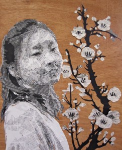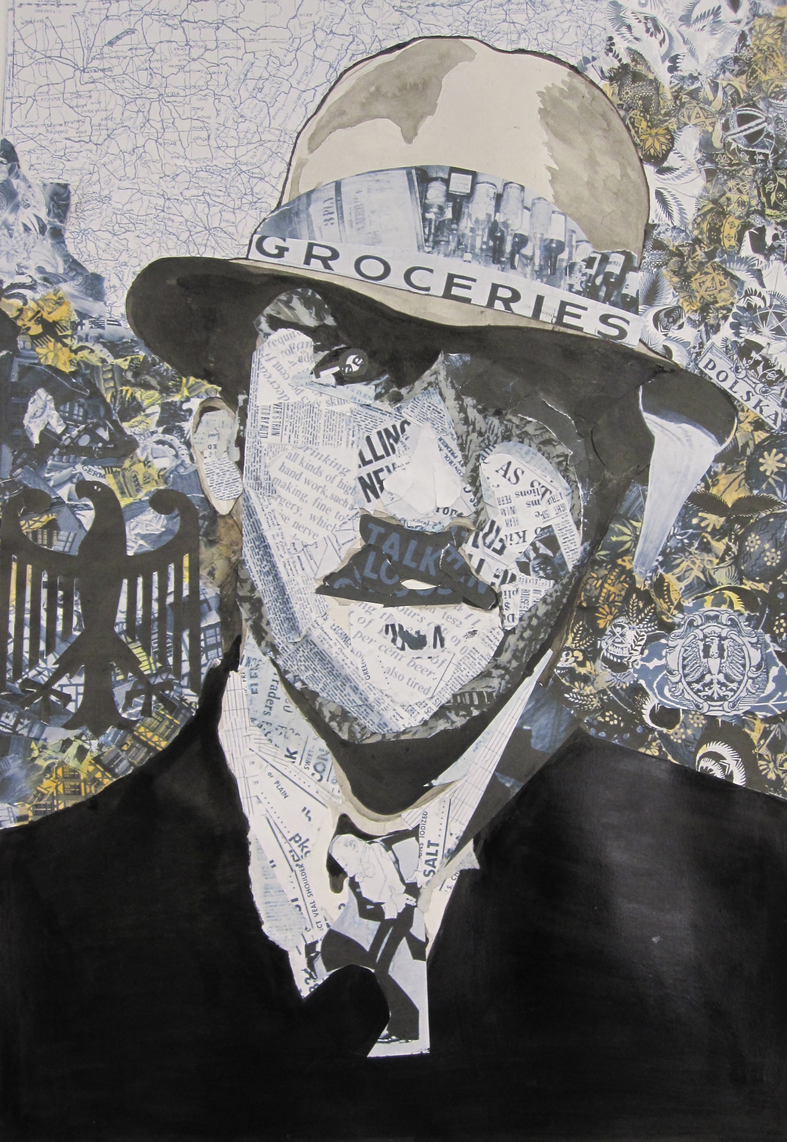The first step was to create an ink wash drawing of the portrait, in grayscale. The second step was to match the ink values to the corresponding value of the images, symbols and photos chosen.