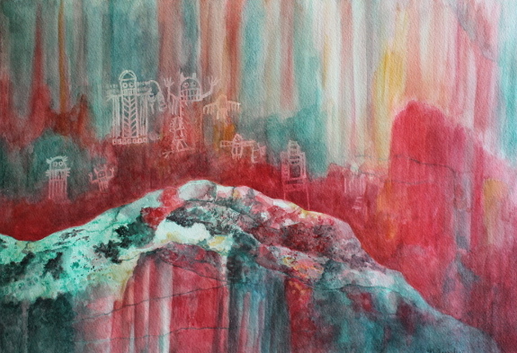 This is another commission that I finished this week and mailed off yesterday. The work is a 14″ x 19″ watercolor on 140 lb Cold Press Paper. The imagery is from a shot of petroglyphs in Wyoming (one of the most beautiful places in the U.S.). It took a practice painting and some studies to figure out how to complete this one. Eventually I learned that it would take masking fluid and many layers to achieve what I wanted. I really like the way that it turned out and thought I would share! It was fun to work on and now I think I will tackle some compositions from our trip to Portland. 😉