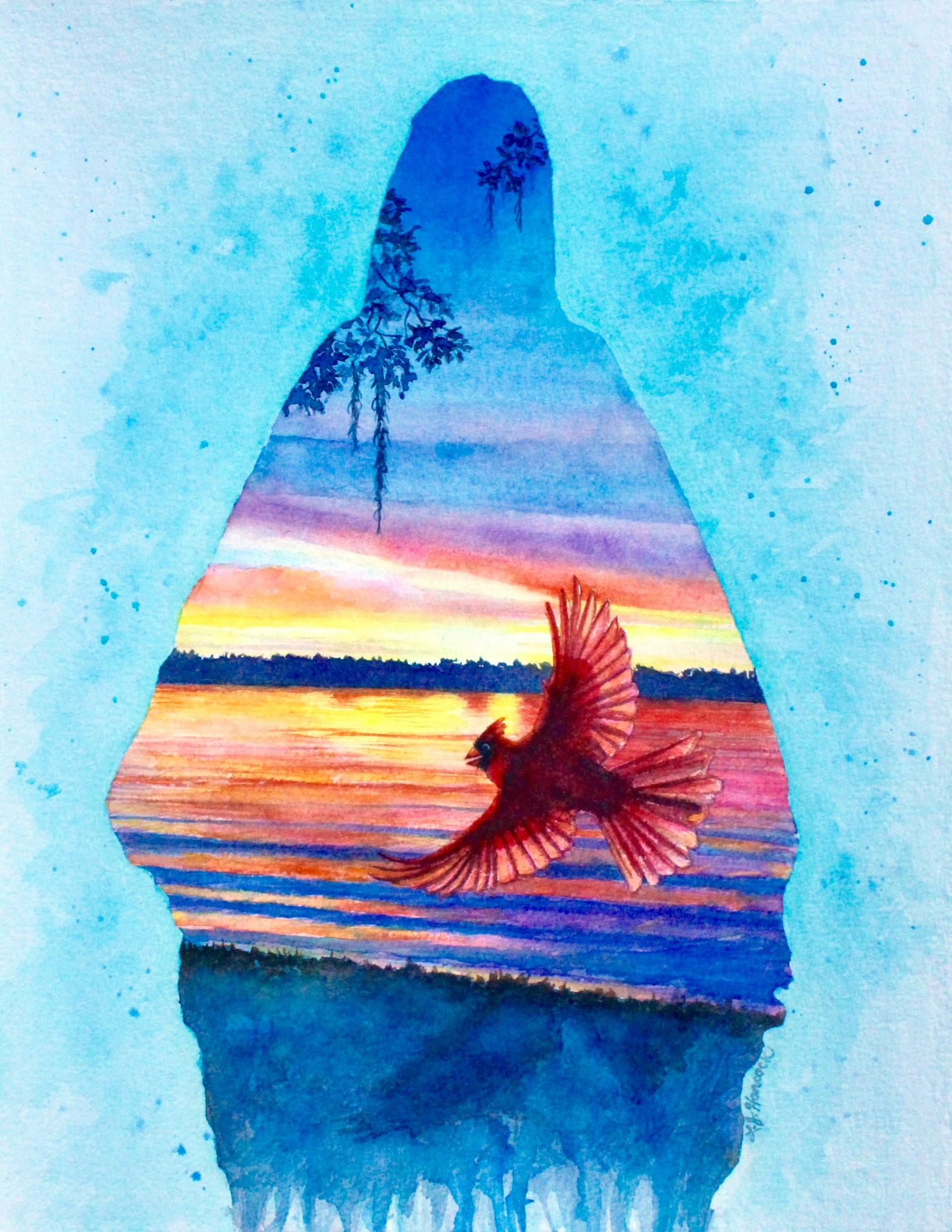 This is a custom work finished in time for Mother’s Day. The subject matter is a silhouette of the current owner’s statue of Mary (the blessed mother) in her garden, with a view of her backyard….as her favorite bird (a red cardinal) flies by.