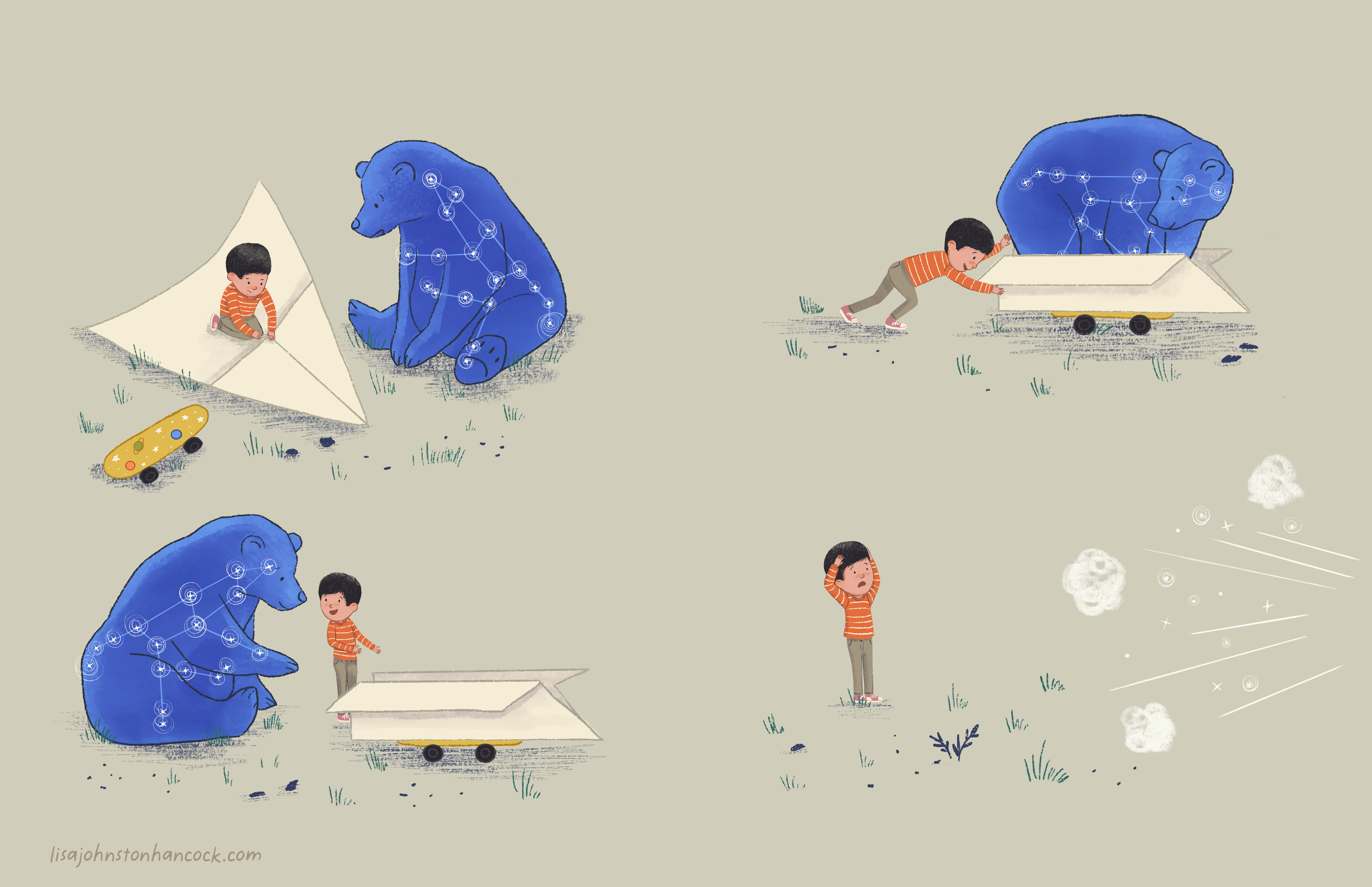 Illustration Story Bloom Spread from Santiago and Great Bear publishing June 30, 2026 Spread from Santiago and Great Bear publishing June 30, 2026 The Burial Let Freedom Read Working Together Joy Wow look at that! Planting Positivity Red-Winged Blackbird Murmuration Catch and Release Spread from I Know That Sound, a book of bird song The Rescue Light the Way Holiday Party Stardust Breaching Whale Keystone Species © 2026 All Images L.J. Hancock