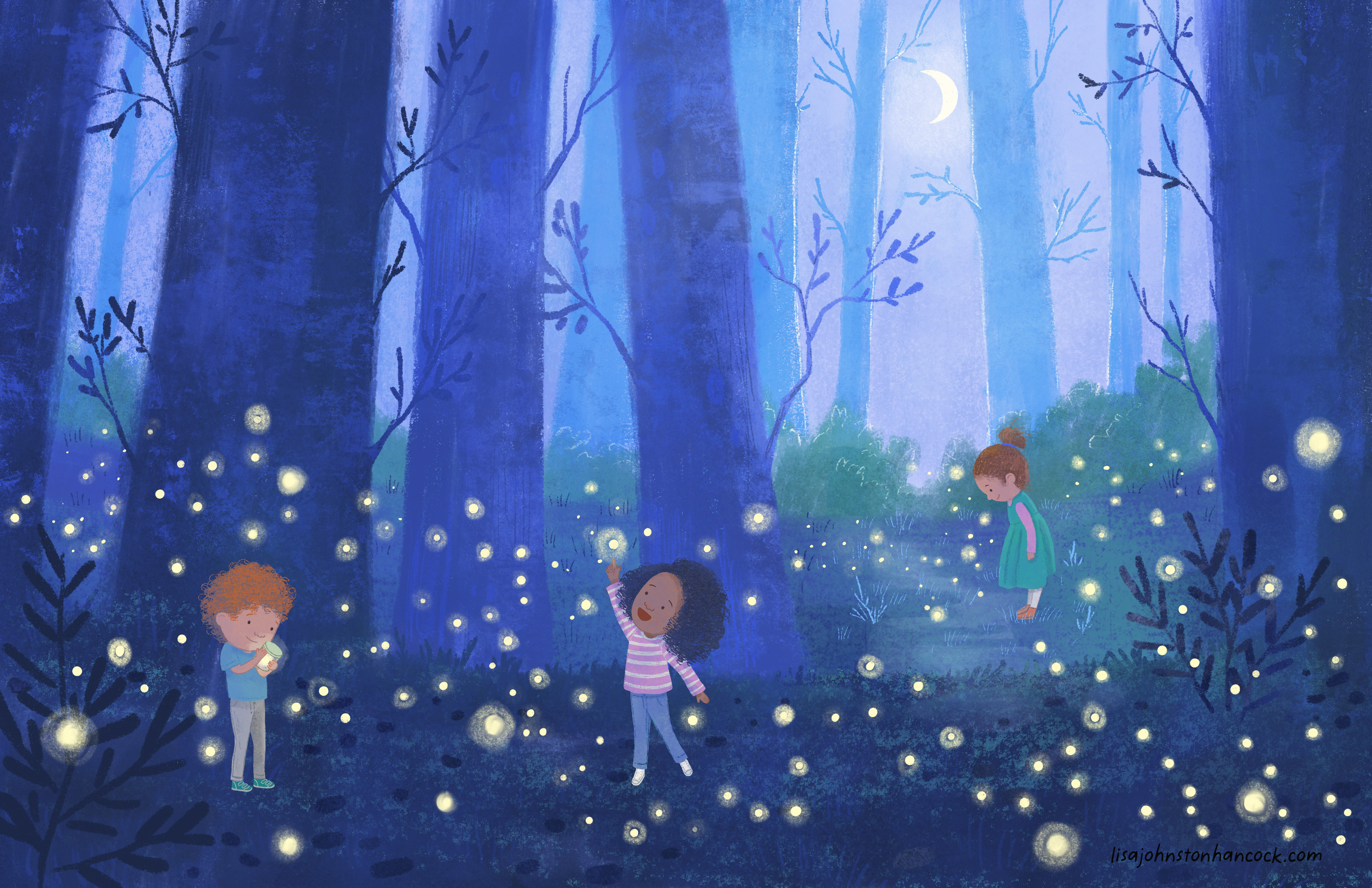 Illustration Story Bloom Spread from Santiago and Great Bear publishing June 30, 2026 Spread from Santiago and Great Bear publishing June 30, 2026 Fireflies The Burial Let Freedom Read Wow look at that! Red-Winged Blackbird Murmuration Catch and Release Spread from I Know That Sound, a book of bird song The Rescue Light the Way Holiday Party Stardust Breaching Whale Keystone Species © 2026 All Images L.J. Hancock